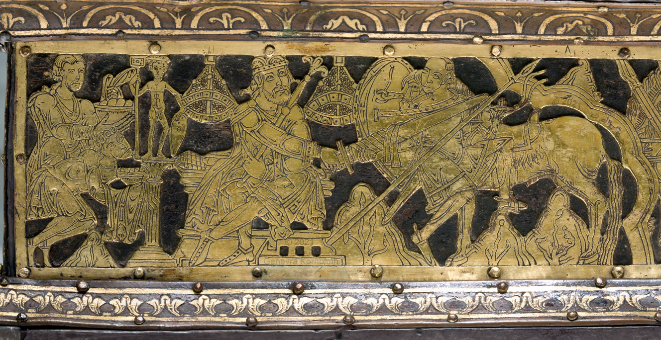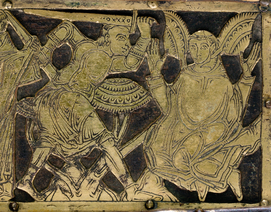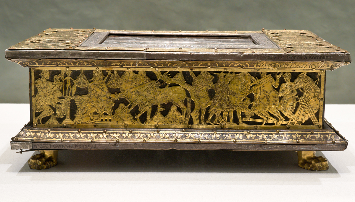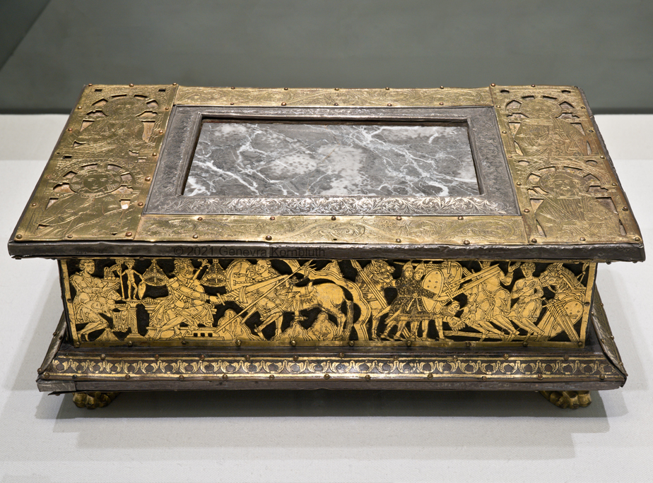 Historical Archive: Abdinghof Altar Portable altar from Kloster Abdinghof Westfalia or Weser region, 1115-1130 often attributed to Roger of Helmarshausen openwork gilt copper on painted oak core; feet gilt cast bronze on iron core 11.8 × 31.1 × 18.5 cm (4.6 x 12.2 x 7.3 inches) silver frame of altar stone 15th c.; stone lost before 1904, modern replacement St. Felix on top probably soon before 1890 loan from Franziskanerkloster to Paderborn Diocesan Museum, PR 50 |