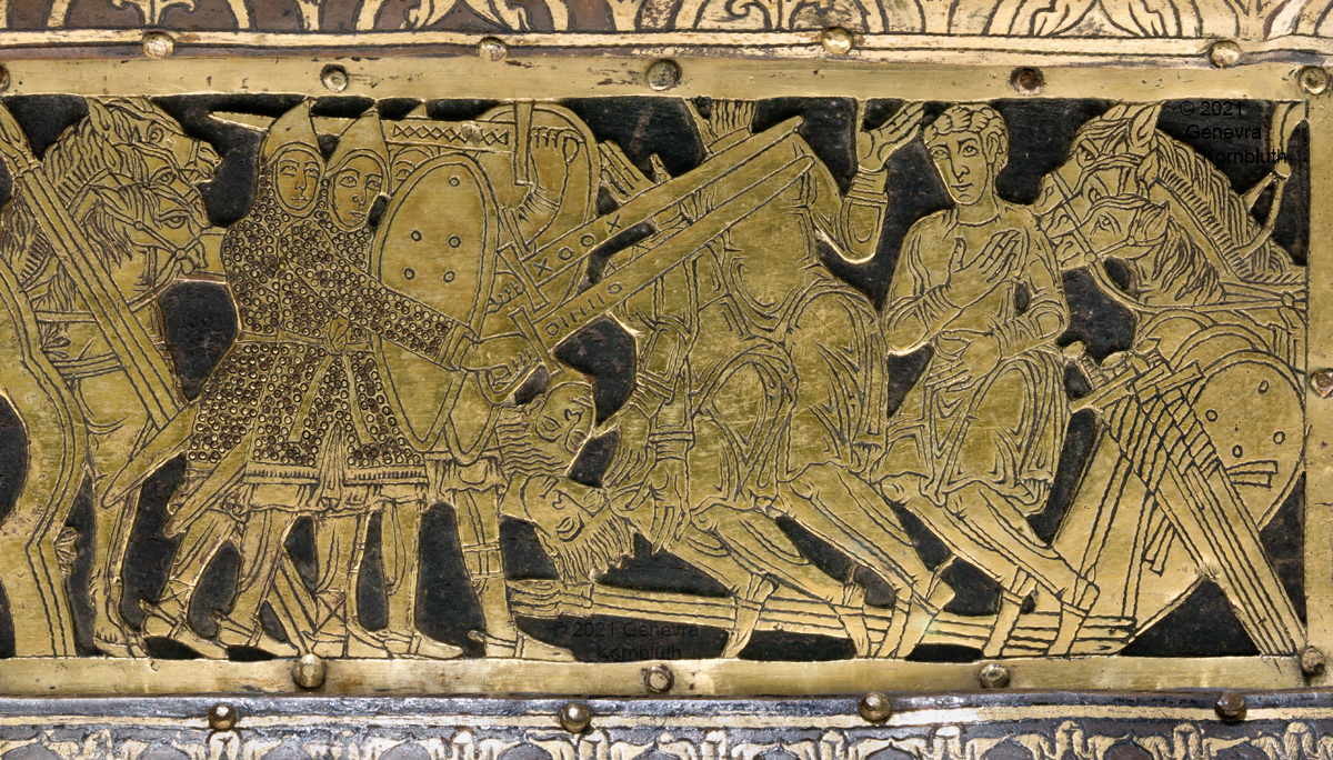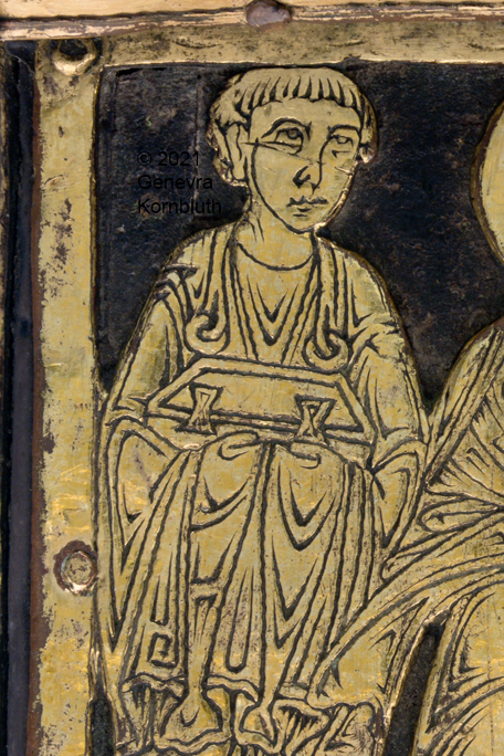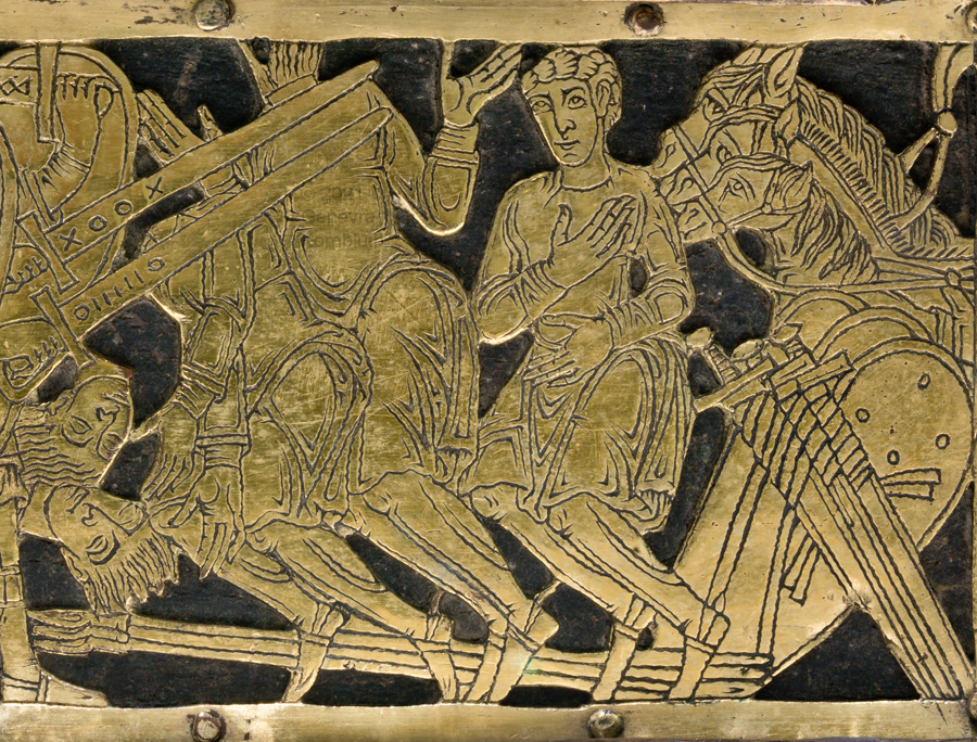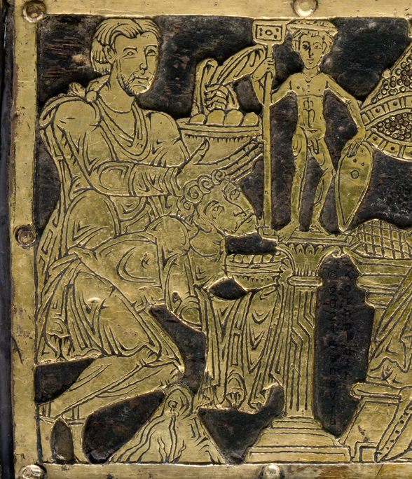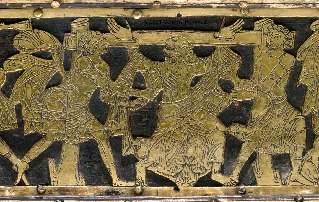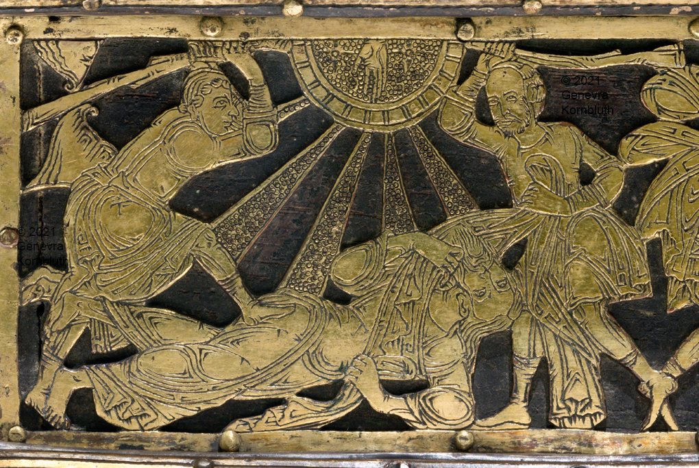 Historical Archive: Abdinghof Altar Portable altar from Kloster Abdinghof Westfalia or Weser region, 1115-1130 often attributed to Roger of Helmarshausen openwork gilt copper on painted oak core; feet gilt cast bronze on iron core 11.8 × 31.1 × 18.5 cm (4.6 x 12.2 x 7.3 inches) silver frame of altar stone 15th c.; stone lost before 1904, modern replacement St. Felix on top probably soon before 1890 loan from Franziskanerkloster to Paderborn Diocesan Museum, PR 50 |