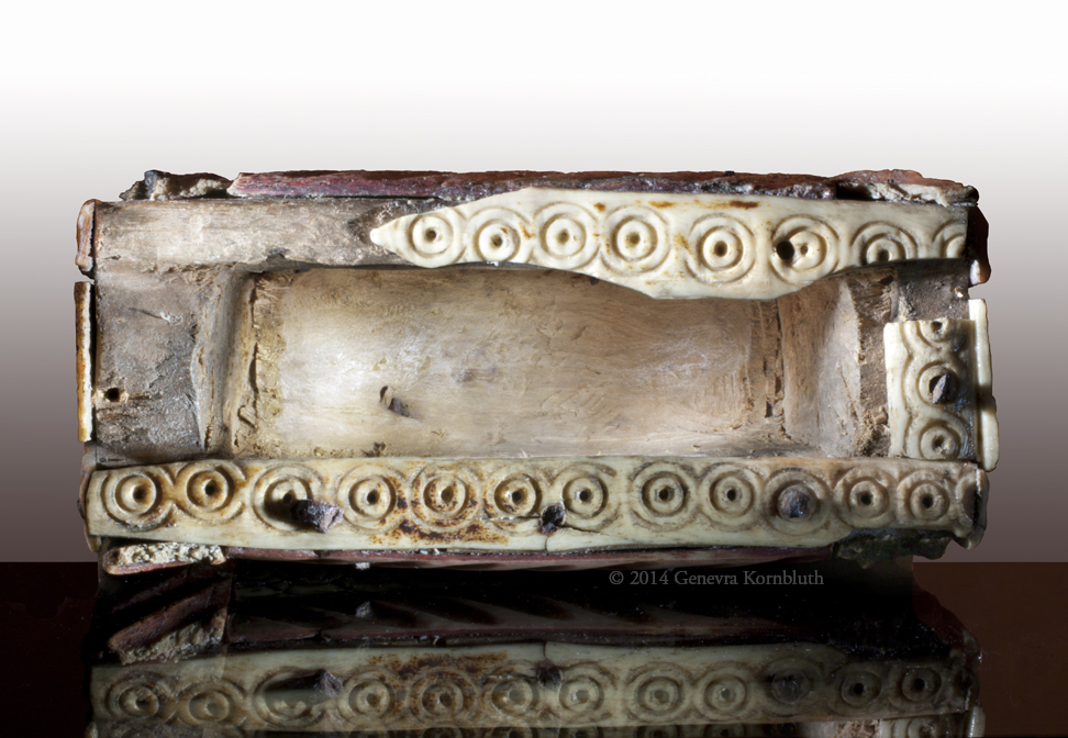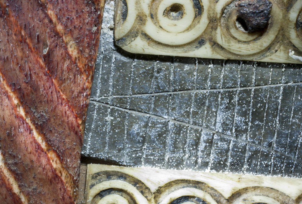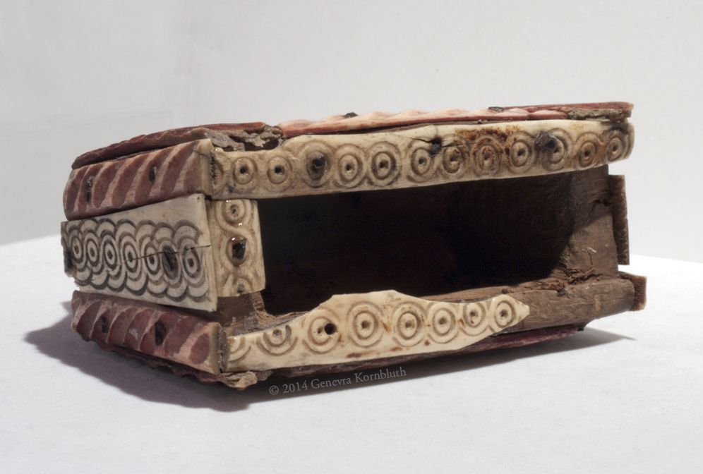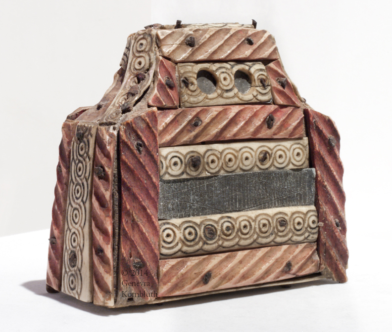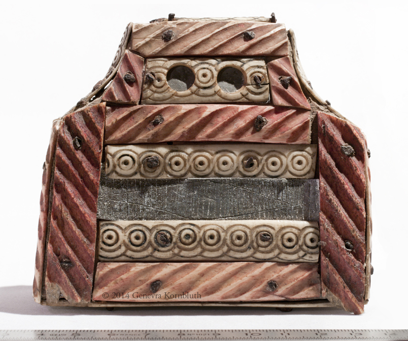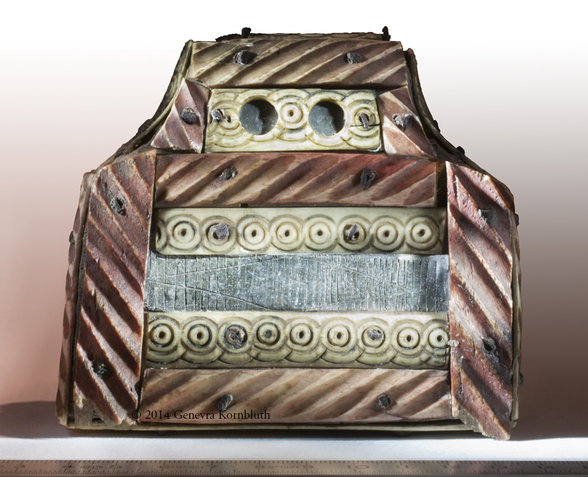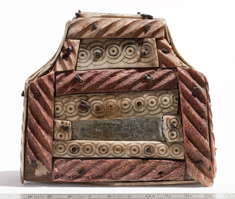Bone and lead on wood core. Height 9.5 cm, width 10 cm, thickness 4.5 cm