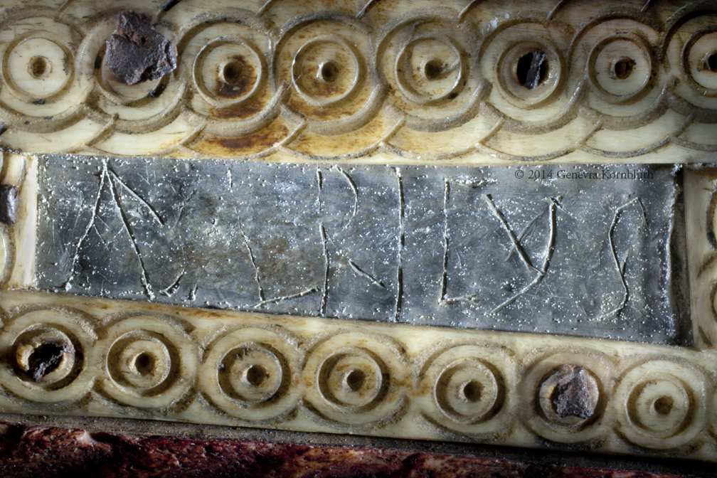 short side left of name side, lower circles strip, detail
