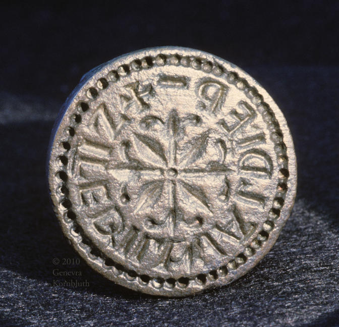 Anglo-Saxon pin head from Glentham Cliff, Lincolnshire, silver gilt, 9th c., Portable Antiquities Scheme LEIC-413B05. For detail and reverse see p.c..