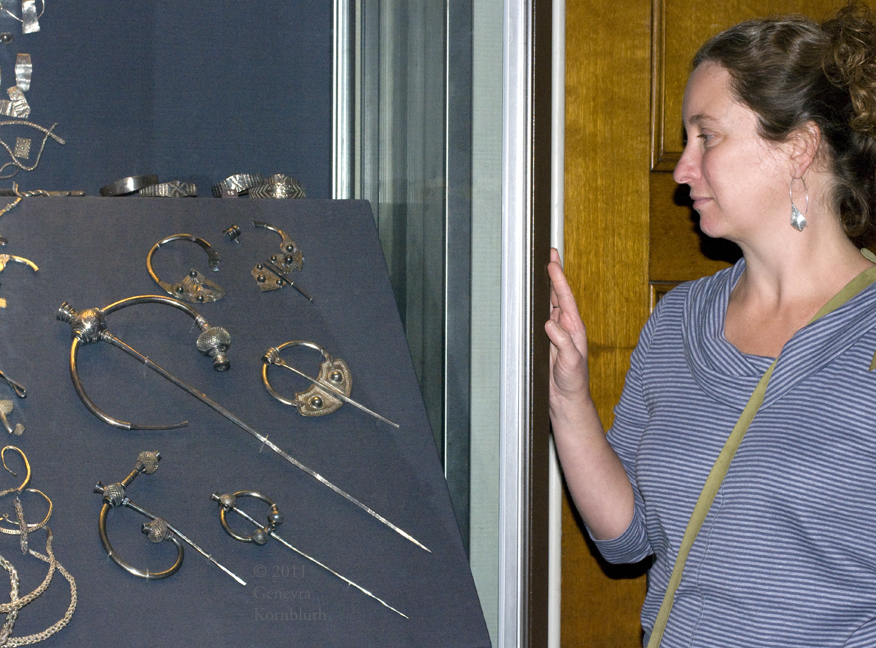 fibulae from Penrith hoard with person for scale, silver, early 10th c., from Fluskew Pike, Newbiggin, Cumbria, Eng., BM MME 1904,1102.3; 1991,0109.1, .3, .4. Not available for publication.