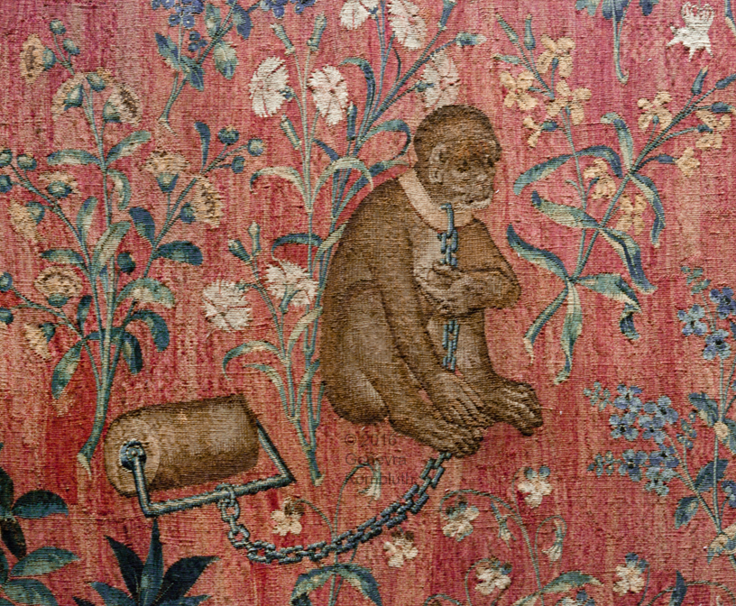 tethered monkey: Lady and the Unicorn, wool/silk tapestry, c.1500, Cluny. For more panels and monkeys see Cluny.