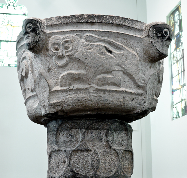 monkey? limestone baptismal font, Mosan c.1200, Schn K112, which has its own page