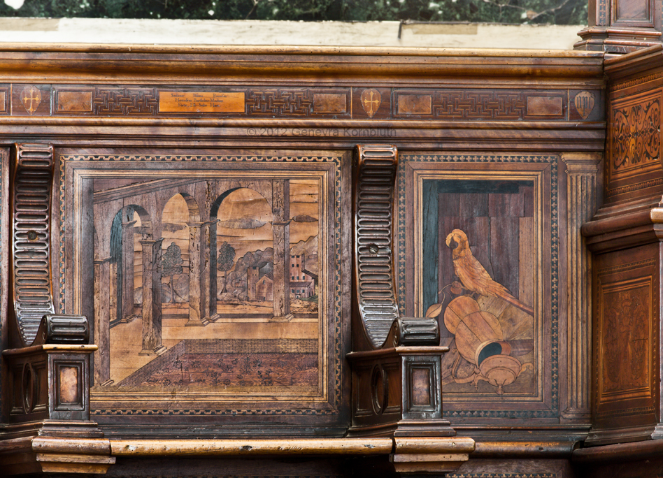 parrot, right: marquetry on archiepiscopal throne, Giovanni Battista del Cervelliera 1536, int. Pisa cathedral, which has its own pages
