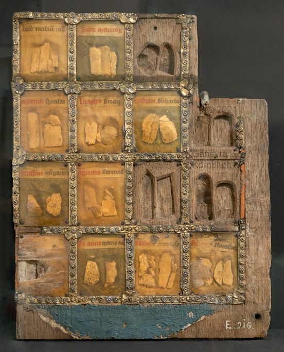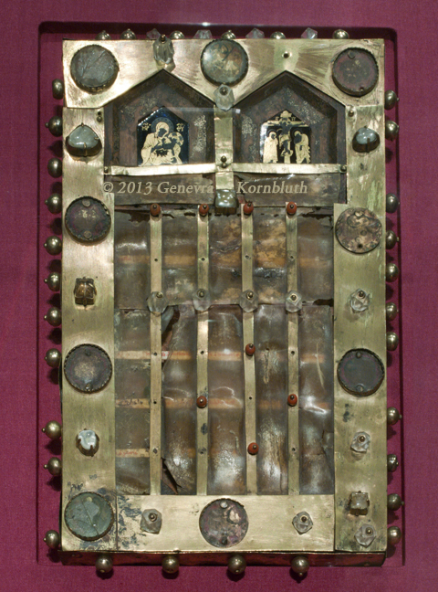 Tablet reliquary, late 13th-c. Mount Athos or Venice; cedar wood, copper alloy, horn, silver, manuscript, glass, beads, gems; MRAH 3225. This work has its own page.