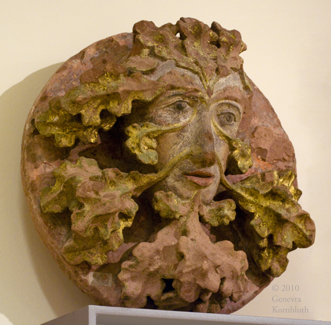 foliate mask (Green Man), sandstone key stone with polychrome, Mainz c.1450, LMM S3125
