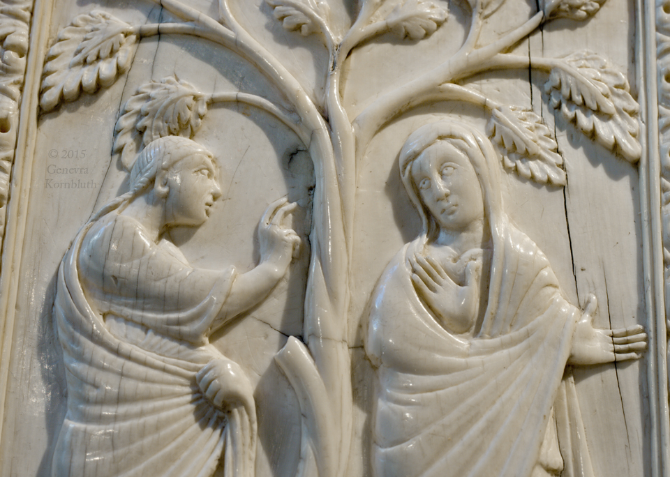Annunciation ivory, c.1000: upper bodies, oblique from below