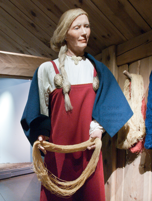 related reconstruction: Viking woman wearing trefoil and tortoise brooches