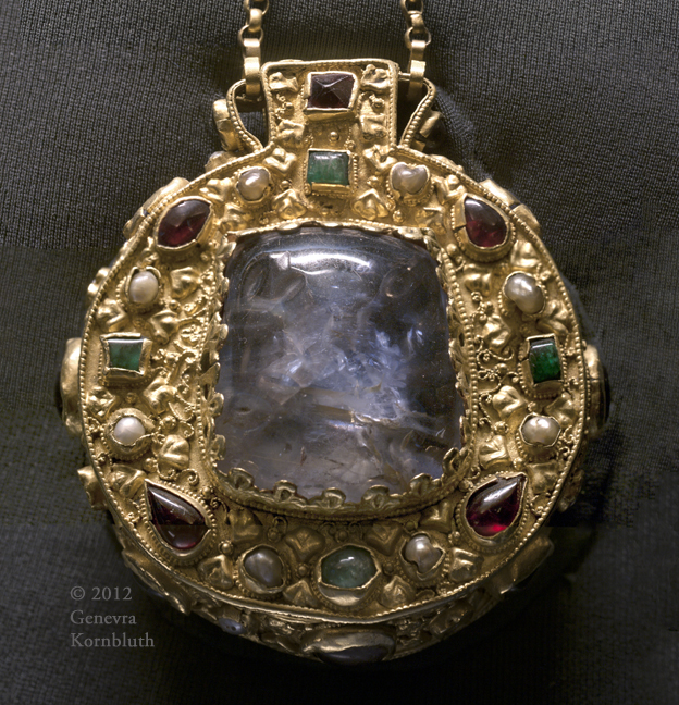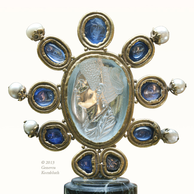 top jewel of "Escrain de Charlemagne", aquamarine intaglio of Flavia Julia Titi (d. 91 CE) (engraved side), sapphires, and pearls in gold, 9th c. (3rd quarter?), CdM Chab. 2089