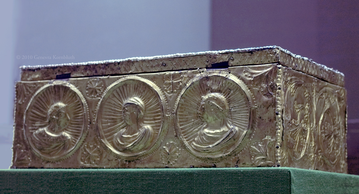 Stephansbursa, gold repoussé reliefs, early 9th c., Vienna Kunsthistorisches Museum Schatzkammer. This object has its own page.