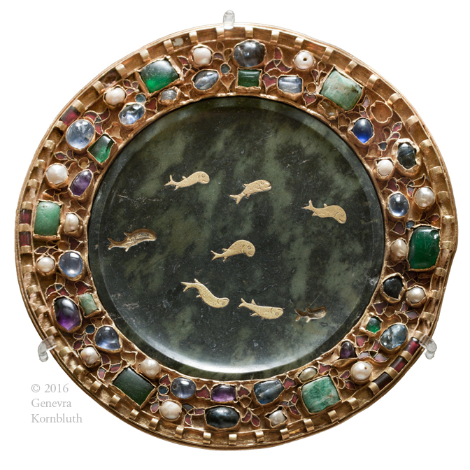 paten, metalwork mid to second half 9th c., serpentine plate 1st c. BCE/CE, fish inlay poss. 4th/5th c., Louvre MR 415. This work has its own page.