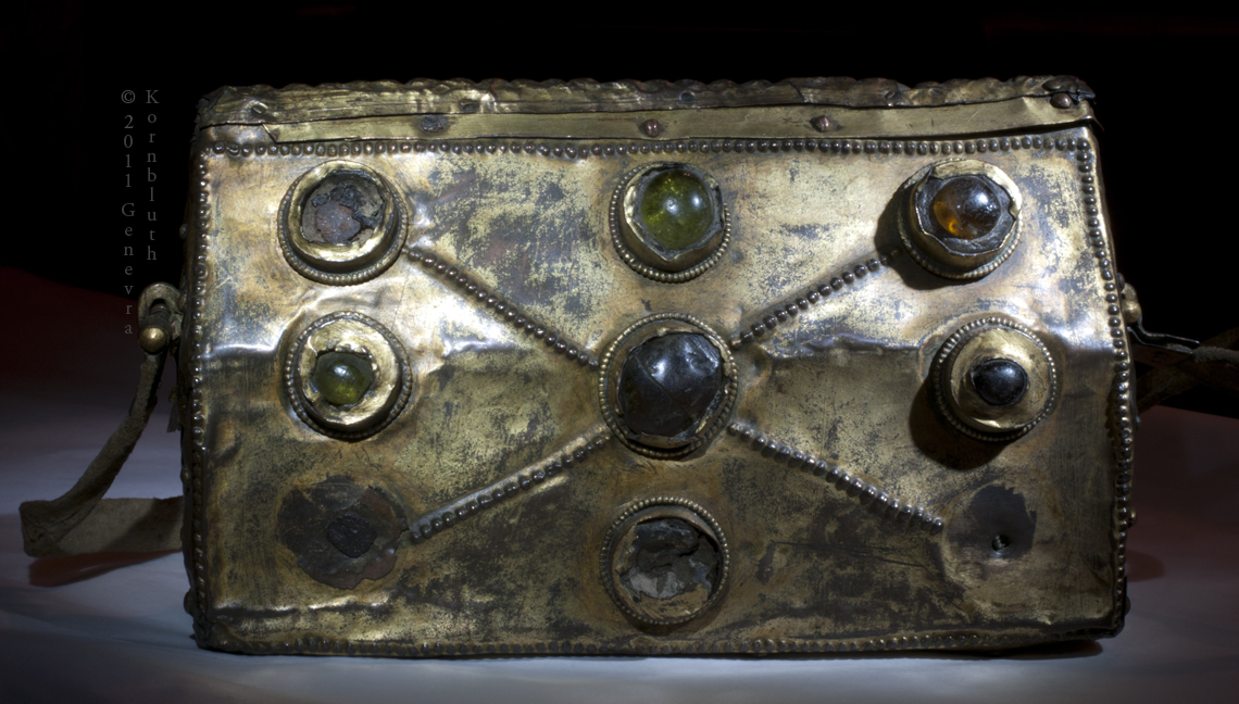 Portable reliquary, copper gilt, glass, and ?amber on wood core with leather strap, prob. late 8th c., Sens CT F.63.70. This object has its own page.
