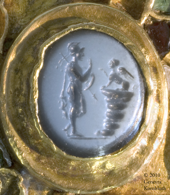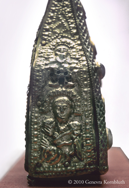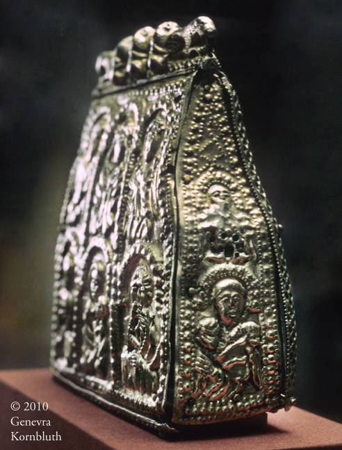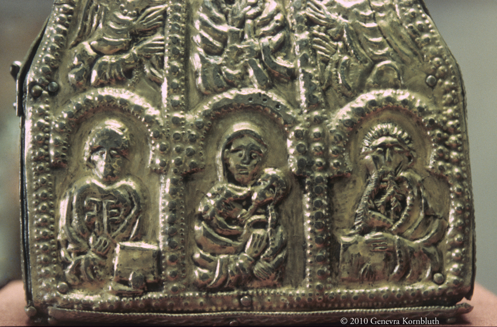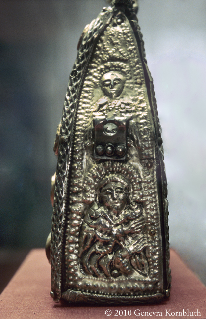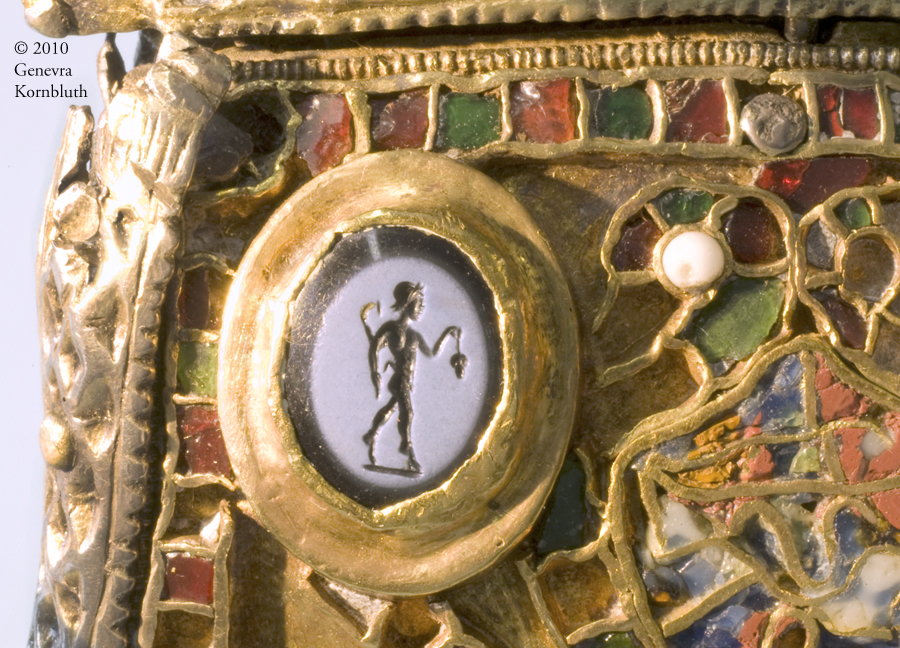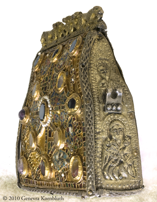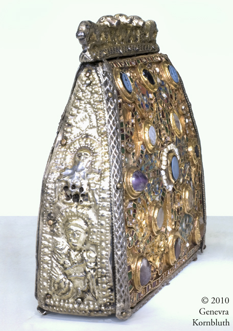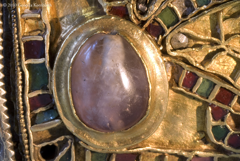 gold, silver gilt, enamel, glass and garnet inlay, and other gems on wood core