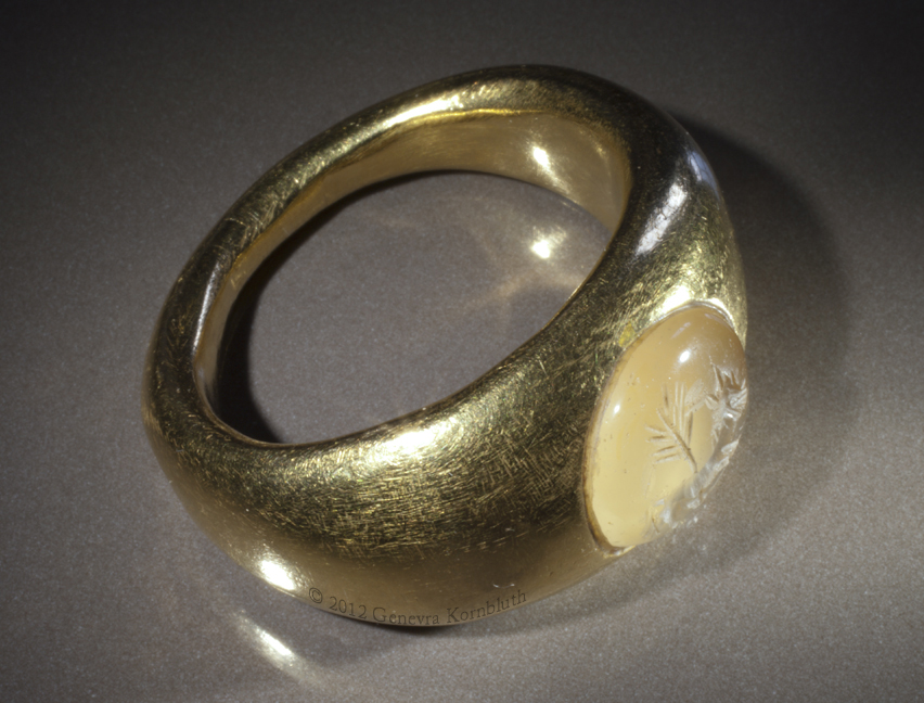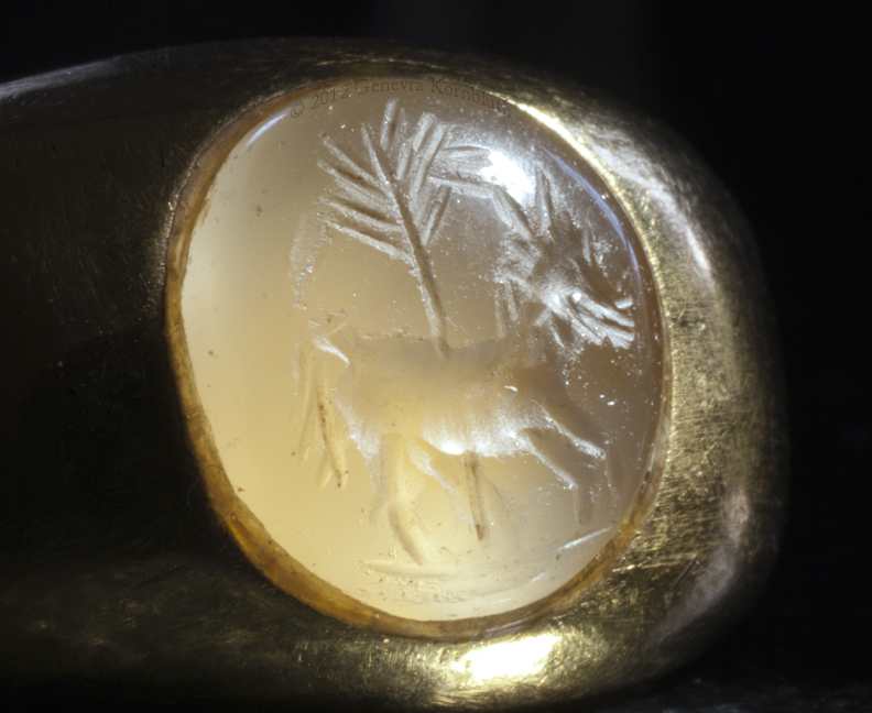 Historical Archive: Donkey seal chalcedony seal, around first century CE, Iran? donkey and palm leaf set in modern hollow gold ring in Roman style collection Sands of Time