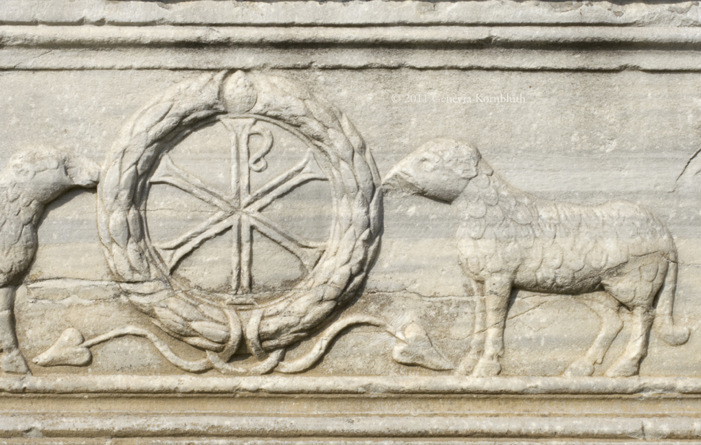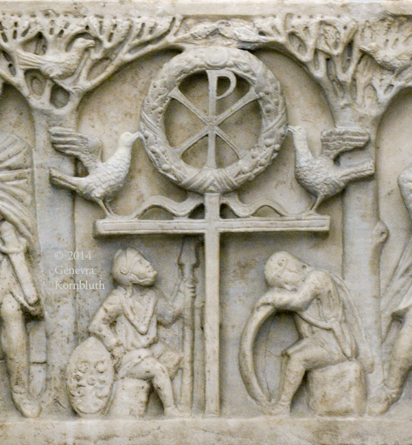 Passion/tree sarcophagus: triumphant cross and olive trees, doves' heads by wreath restored; marble, Rome c.360, Vat 28591