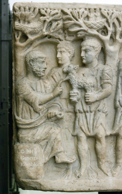 Shepherd sarcophagus from Catacomb of Praetextatus (Three Shepherds Sarcophagus; Christian?), marble c.370-400, Vat 31554 (ex 191A). This work has its own page.
