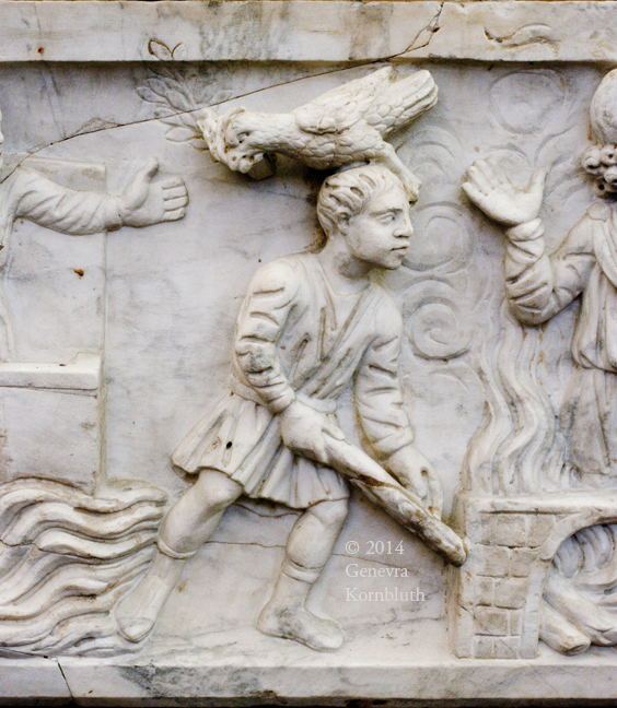 Noah's dove and man feeding wood to fire: sarcophagus lid fragment from Rome, near Saint Sebastian, 1st third of 4th c., Vat 31471 (ex 134).