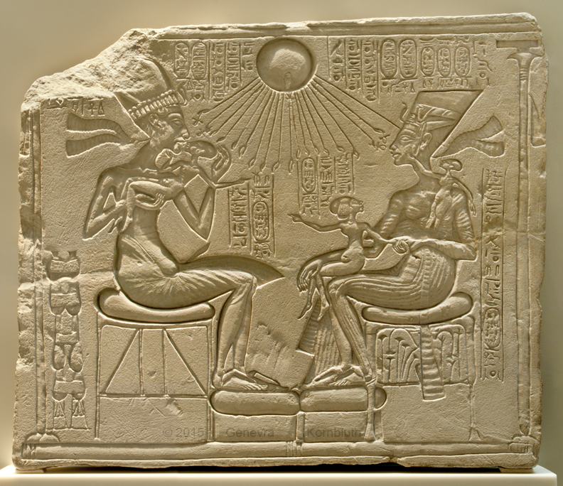 Akhenaten, Nefertiti, 3 daughters, limestone, c.1345 BCE, SMB EgMP ÄM 14145, which has its own page