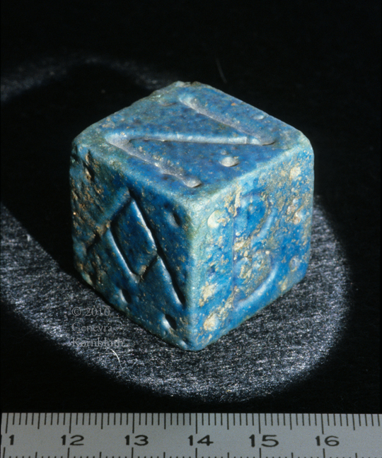 undated gaming die with dots and Greek letters, faience, Egypt, Louvre E 13938