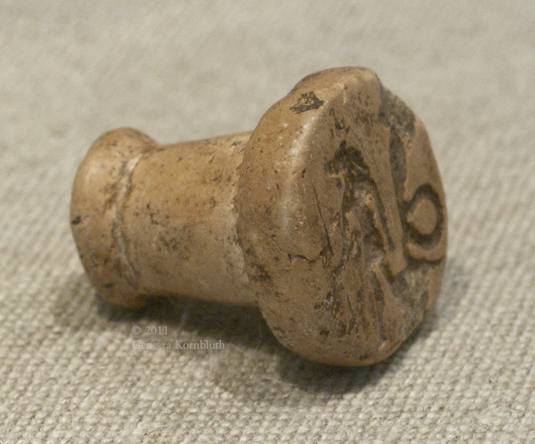 seal matrix or stamp with crocodile god, bone, from Soknopaiou (Dime, Egypt), prob. Roman period, KM 0000.02.1767