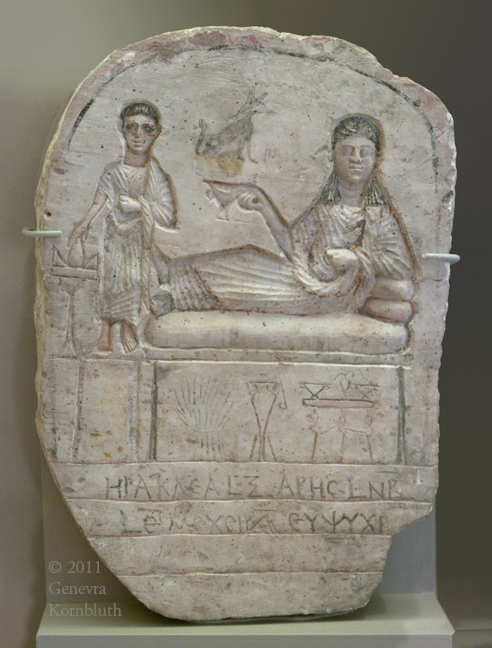 funerary stela of Herakela (age 60) and Ares (age 52), limestone and paint, 2nd-early 4th c. Terenouthis (Egypt), KM 0000.02.1179