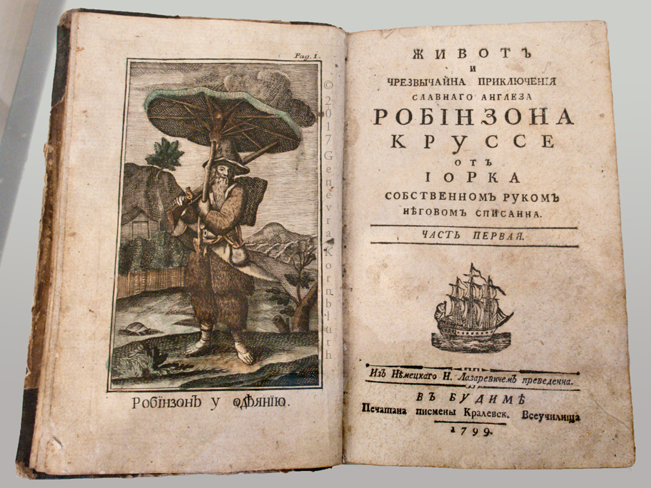 Robinson Crusoe in Serbian, Buda 1799, Belgrade MAA 4246. For detail see Belgrade MAA.