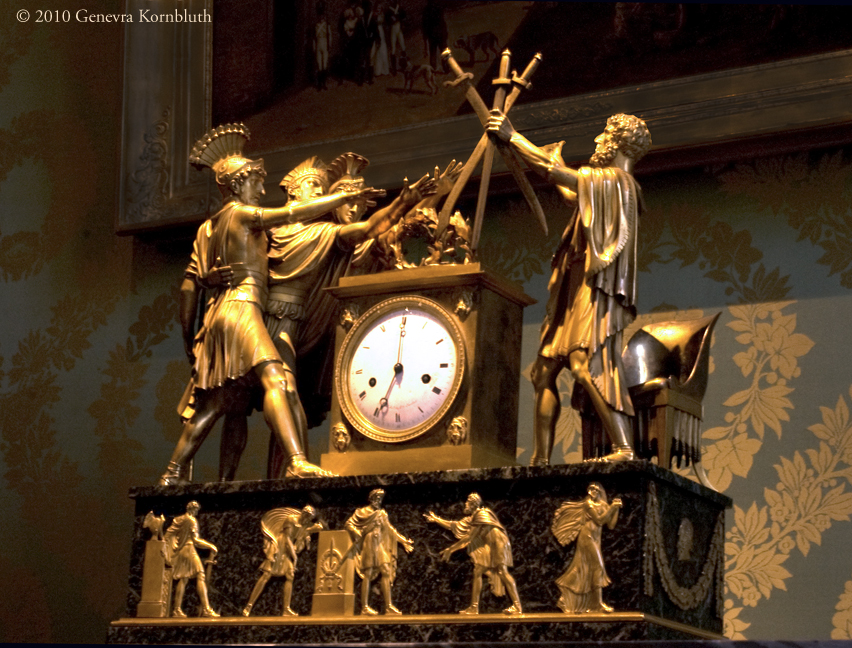 clock in the form of The Oath of the Horatii (aft. Jacques- Louis David), bronze gilt and marble, clockwork: Le Roy, early 19th c., Musée Carnavalet Paris