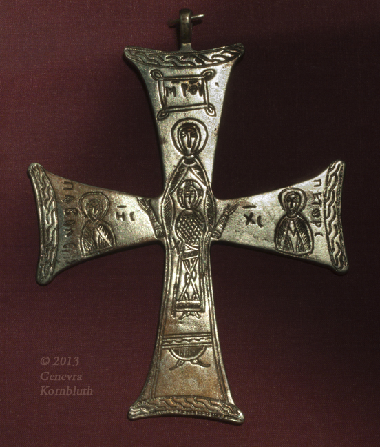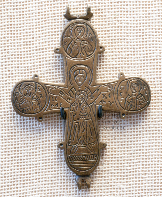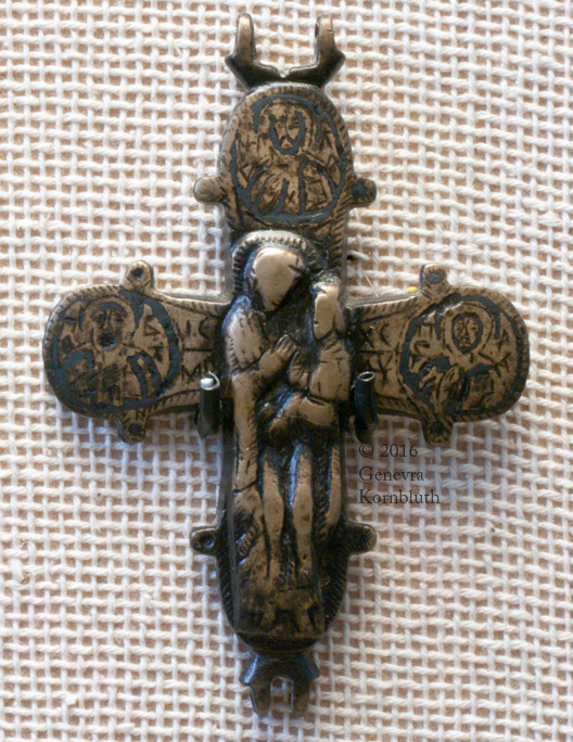 cross encolpion, copper alloy?: engraved Virgin and Child, Kiev c.1000-1250, MSHM