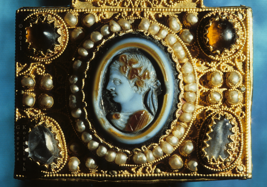 cameo empress, banded agate, 1st half of 1st c. CE, recut into an emperor, poss. in *11th c., on Enger cross c.1100, KGM 88,635. The cross has its own page.