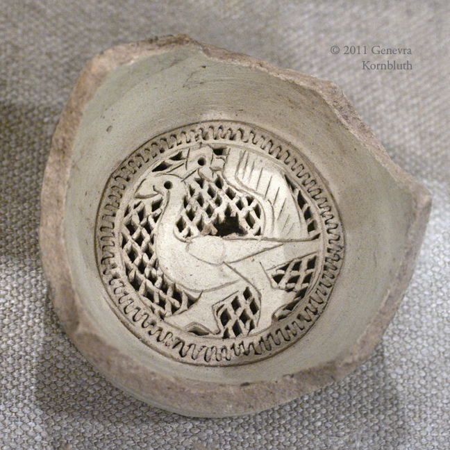 water strainer with peacock, ceramic, Fatimid Egypt 909-1171, KM 1971.01.0013