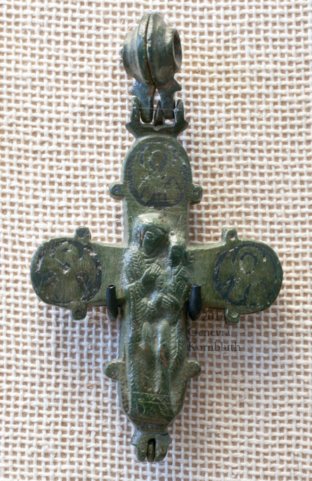 Byzantine pectoral cross with St. George, copper alloy, 11th-13th c., MRAH ACO.75.1.3