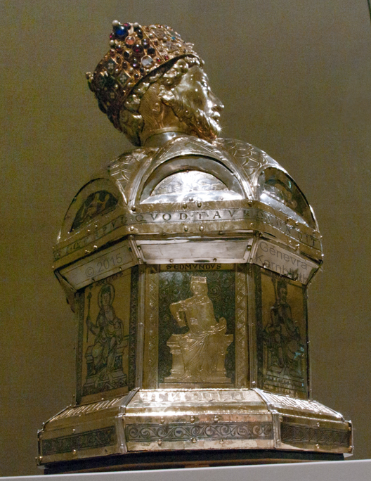Head Reliquary of Pope Alexander; silver gilt with enamel and gems over wood core, c.1145, MRAH 1031. This work has its own page.