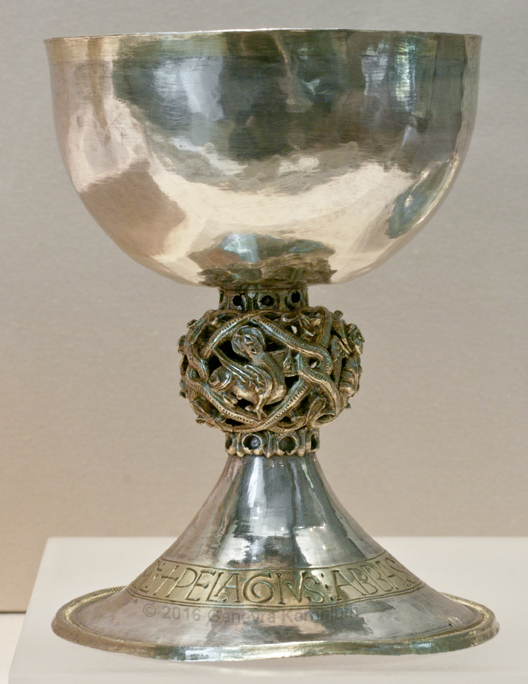 chalice of Abbot Pélage, silver/gilt, Spain 1135-40, Louvre OA 3201A. For knop detail see Louvre.