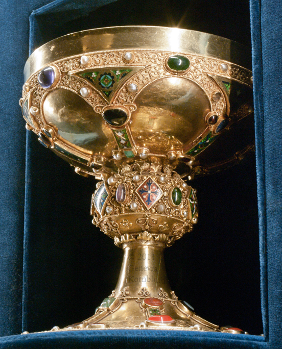 Heinrichskelch, 12th c. German silver gilt with Fatimid rock crystal cup c. 1000, Munich Reisdenz Schatzkammer. For another view see Munich.