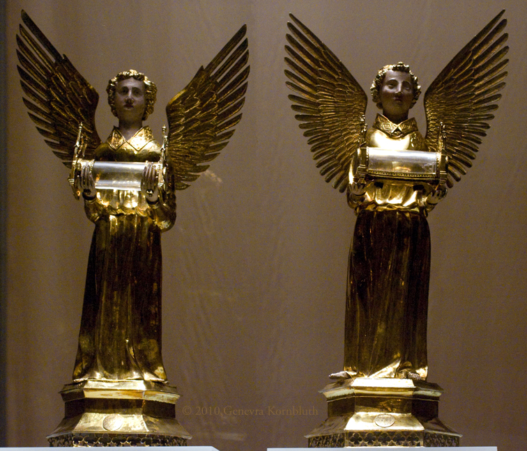 angel reliquaries from the treasury of the Order of the Holy Spirit (left with stamp of Toulouse), silver gilt with paint, France 15th c., Louvre MR 551, 550. These works have their own page.