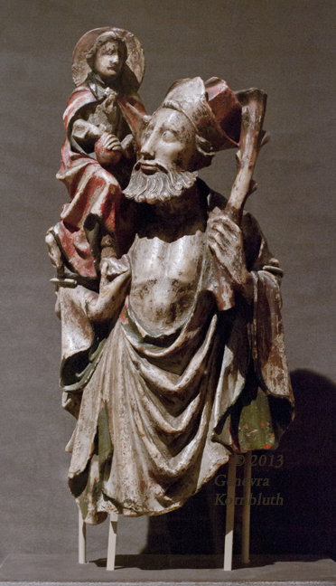 St. Christopher carrying Christ child, alabaster with polychrome and gilding, 15th-c. England , UMMA 1961/1.178. For other views see UMMA.