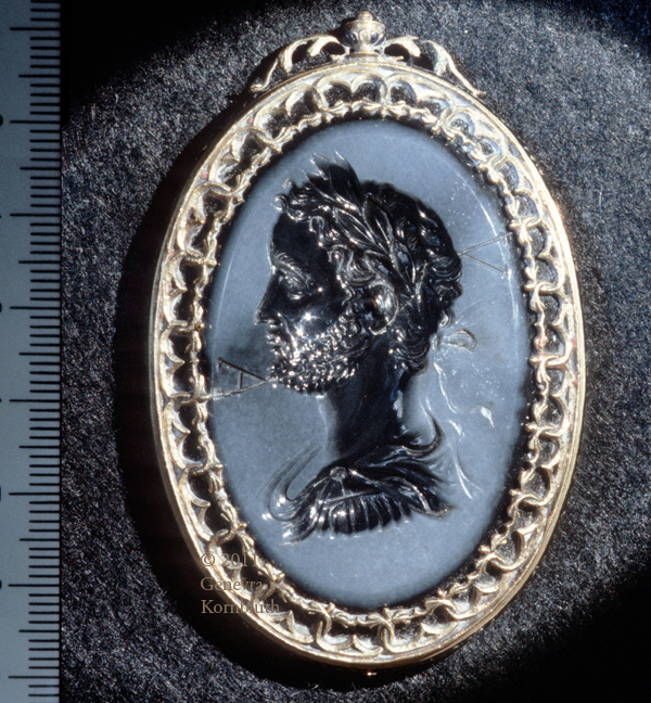 Antoninus Pius (131-68), Roman or 15th c. niccolo agate profile laureate intaglio in 16th c. gold mount, CdM Chab. 2093. For mount reverse see CdM.
