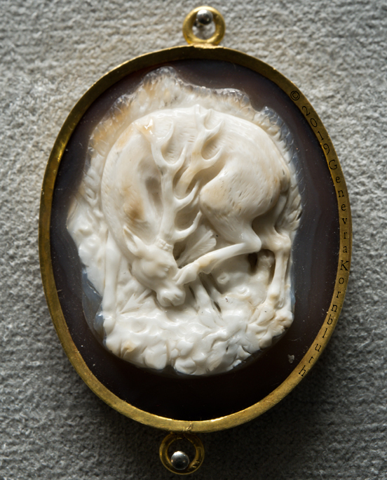 stag wounded by arrow, sardonyx cameo, 15th or 17th c., Florence MA 14584