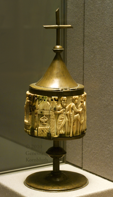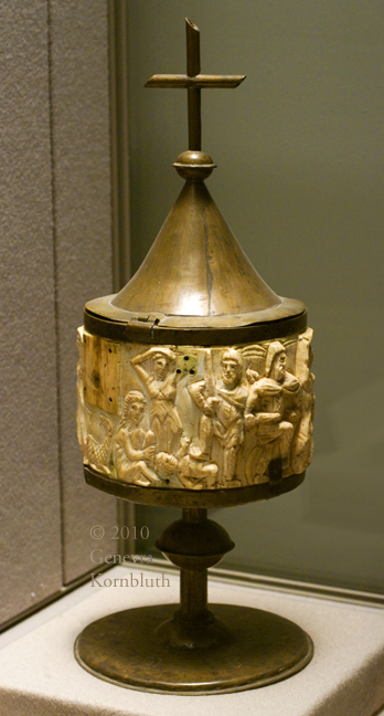 copper mount France 15th c., holding ivory pyxis c.550-600, Louvre OA 5524 A. This object has its own page.