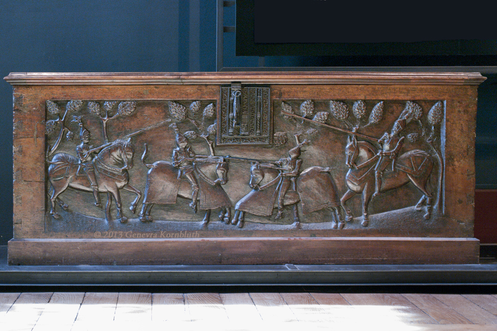 Wood chest with tournament, 15th-c. France, Cluny Cl.8919. For another view see Cluny.