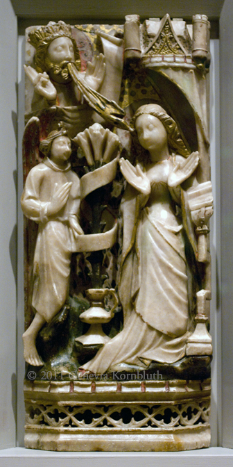 Annunciation, alabaster with paint and gilding, 15th c. Nottingham, PMA 1945-25-107 (pair with 1945-25-108). For detail see PMA.