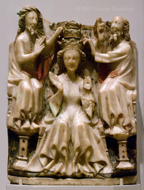 Coronation of the Virgin, alabaster with paint and gilding, 15th c. Nottingham, PMA 1962-67-7. For another view see PMA.