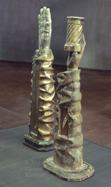 arm reliquaries, painted wood with horn inserts, late 15th-c. Brunswick, from Guelph Treasure; left: One of the Thousand Saintly Warrions, KGM W41