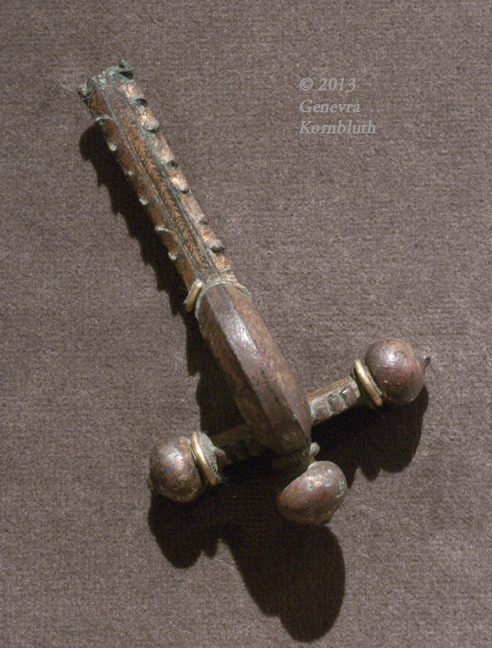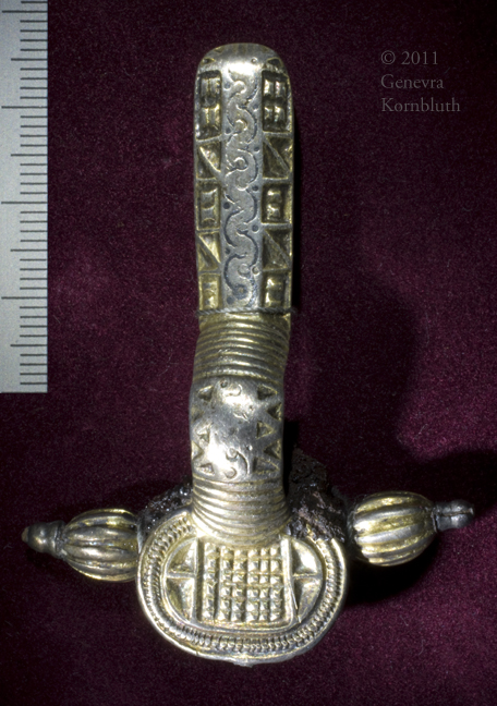Crossbow fibula, gilt bronze, c.450-500 Belgium or NE France, UMMA 1966/2.17. For profile view see UMMA.