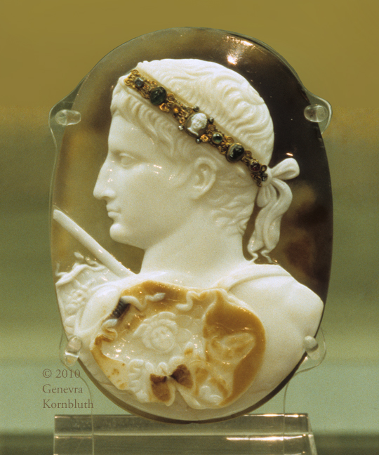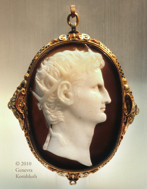 Augustus (d. 14 CE) from Marlborough Collection, banded agate cameo, RGM 70.3. For an earlier Augustus see Lothar cross.