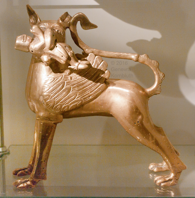 gryphon gripping knight, copper alloy aquamanile fr. Strinda, c.1300-1350, Bergen MA 67. For oblique and detail views see Bergen.