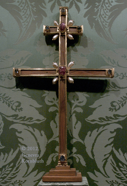 Reliquary cross "of Charlemagne"; gold, niello, enamel, sapphire, ruby, pearl, wood; early 14th c., Sens CT TC.D'5