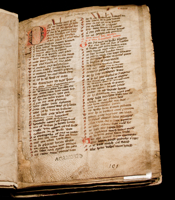 St. Francis legenda maior by Jacob van Maerlant, c.1300-50, Leiden University Library BPL 101, fol. 02r. For full opening see Leiden.