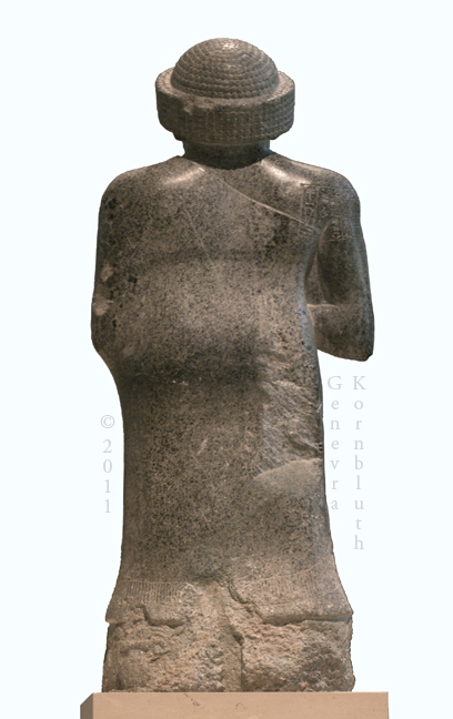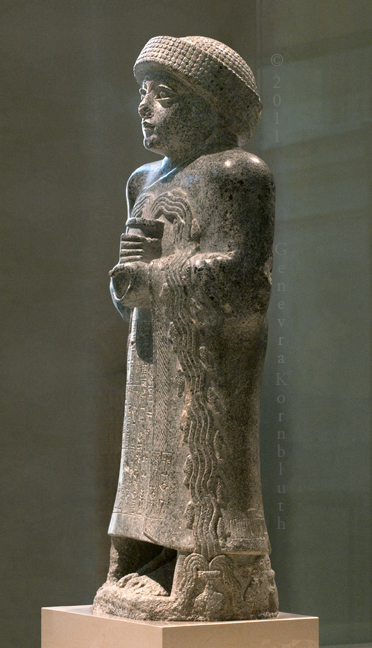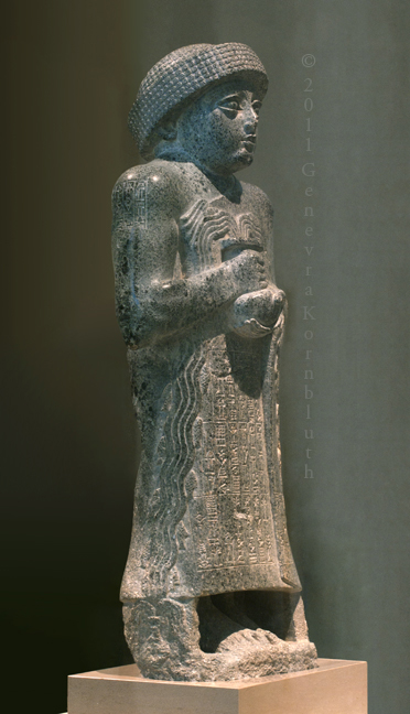 Historical Archive: Gudea, prince of Lagash, holding an overflowing vase; Gudea "au vase jaillissant" from Girsu (modern Tello, Iraq). Neo-Sumerian, c.2120 BCE. Dedicated to the goddess Geshtinanna. Dolerite, 62 x 25.6 cm. Louvre, Near Eastern Antiquities AO 22126